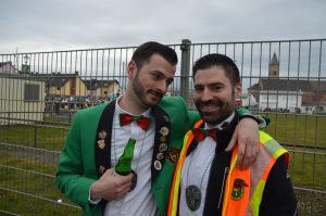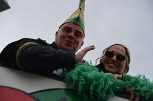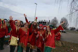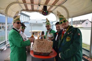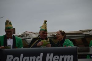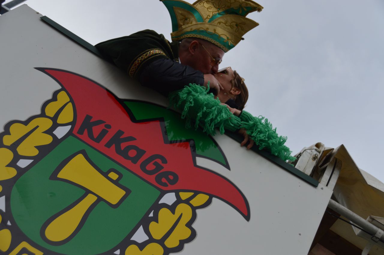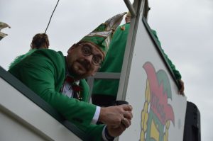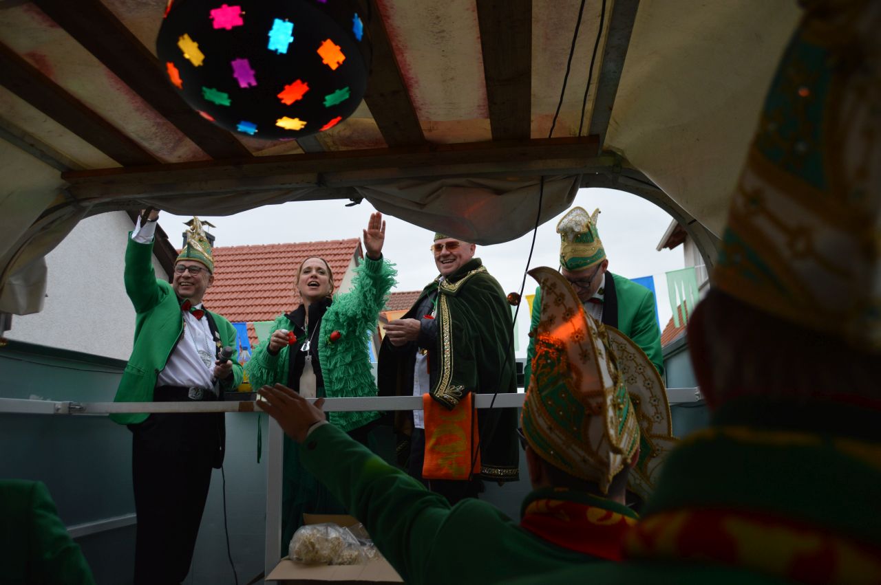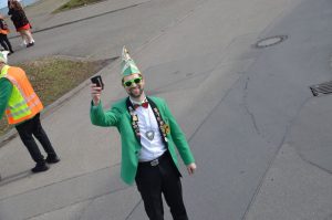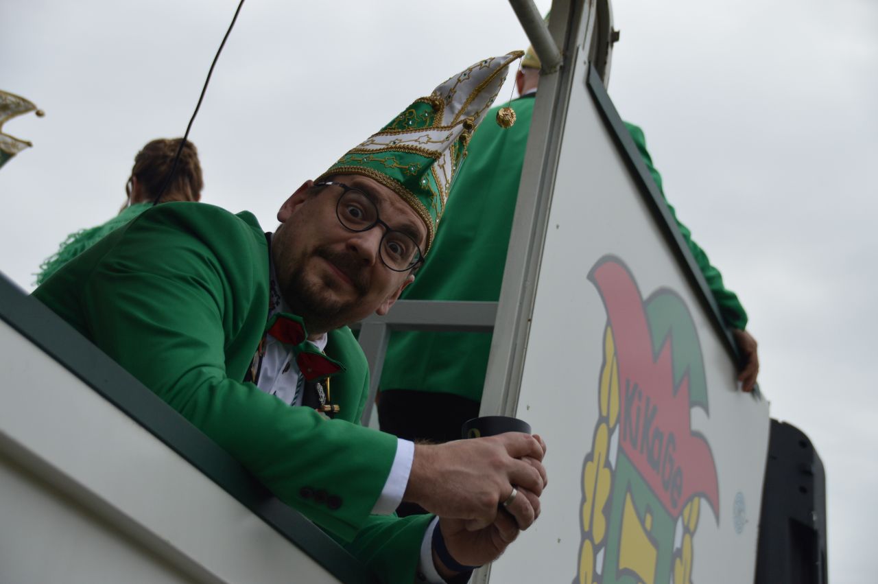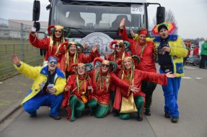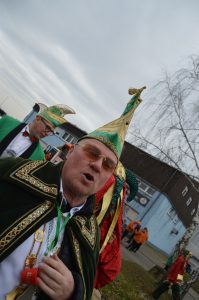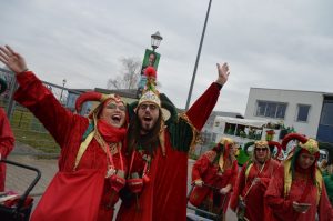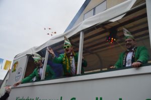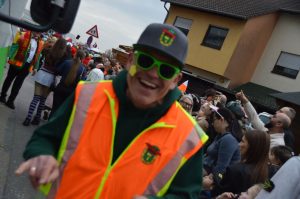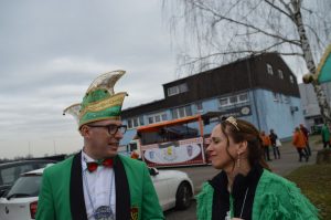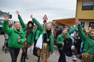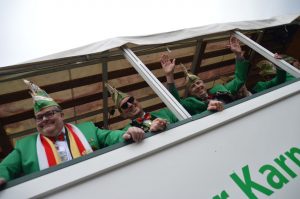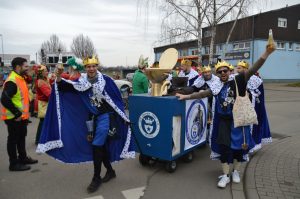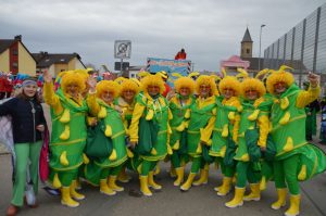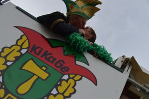 Abordnungen der KiKaGe, bestehend aus Elferrat, Ehrenelferrat und natürlich dem Prinzenpaar Iris II. und Jürgen IV., besuchten am Samstag gleich 2 Prunksitzungen. Die größte Abordnung, insgesamt 37 Teilnehmer mitsamt Prinzenpaar, wurde nach Wiesental zur Prunksitzung des KHC entsandt. Eine weitere Abordnung besuchte die Prunksitzung des FFC Forst. Schon am Vormittag gegen 10 Uhr hatte das Prinzenpaar zum Umtrunk eingeladen, bevor es zum Umzug nach Kronau weiterging. Die Kirrlacher Karnevals-Gesellschaft war hier wieder sehr stark mit 83 Teilnehmern vertreten! Der Tross, mit der Startnummer 27, bestehend aus unseren Spraddlfrauen der Prinzengarde und unseren Trainerinnen, gefolgt vom Spraddl-Shuttle mit den Hoheiten und Ehren- und Elferrat, schlängelte sich bei angenehmen 15 Grad Celsius und strahlendem Sonnenschein durch die sehr gut besuchten Straßen von Kronau!
